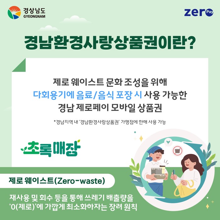 환경사랑상품권은 제로페이와 연계한 모바일 전용 상품권으로 10% 할인된 가격으로 최대 10만원까지 상품권을 구매할 수 있으며, 초록매장에서 일회용기 대신 텀블러 등 다회용기를 활용 포장 주문할 때 사용 가능하다.