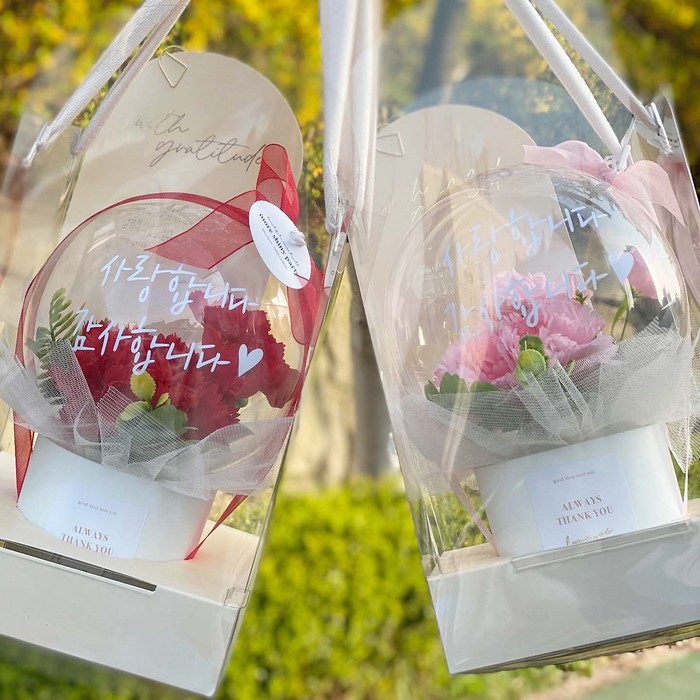 더빛나는파티의 카네이션 꽃풍선은 PVC 풍선 속에 고급 실크 조화가 들어가 날카로운 곳에 터지지 않으면 영구적인 보관이 가능하며 레터링 문구가 들어간 특별한 선물이 될 전망이다. 상품은 달링백형과 무드팟형 중 선택할 수 있다.