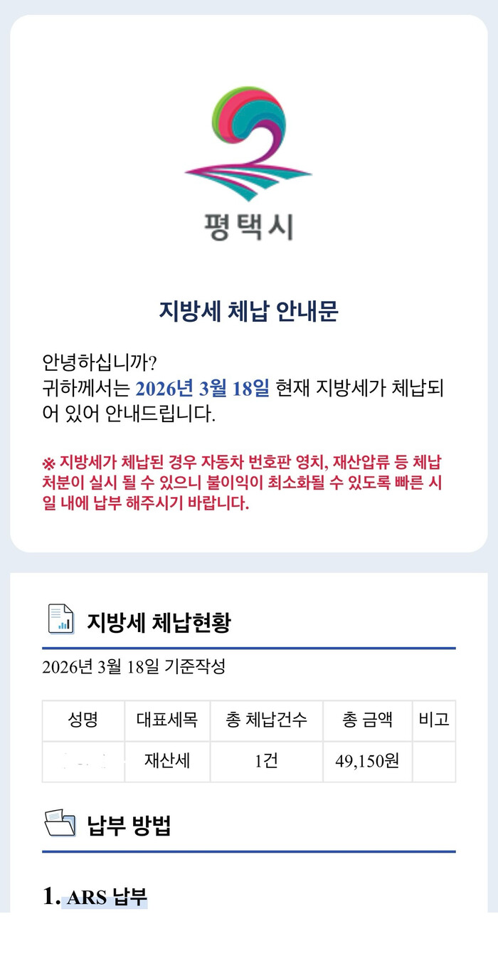 [평택=오왕석 기자] 평택시(시장 정장선)는 ‘모바일 전자고지 시스템’을 활용해 지방세 체납자 1만7천여 명을 대상으로 오는 23일과 24일 이틀 동안 전자문서 형태의 체납안내문을 발송할 예정이다.