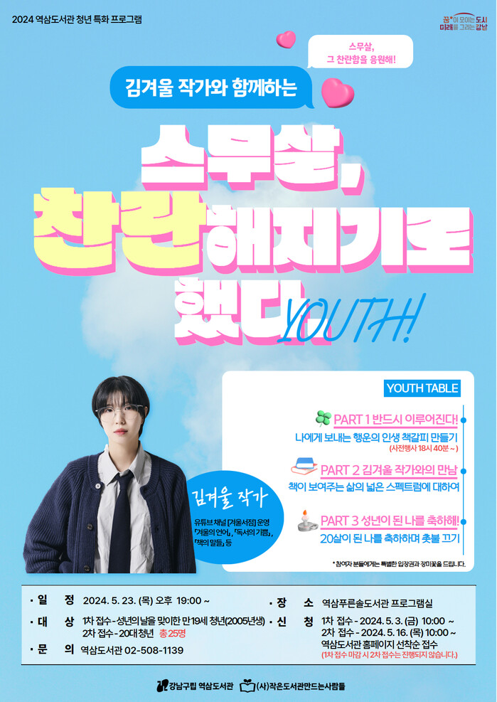 [시민일보 = 이대우 기자] 강남구립역삼도서관이 오는 23일 오후 7시, 역삼푸른솔도서관 프로그램실에서 '<스무살, 찬란해지기로 했다'를 오는 진행한다.