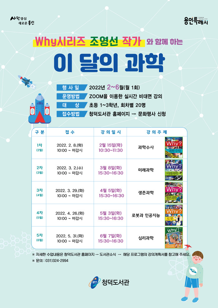 [용인=오왕석 기자] 용인시 청덕도서관이 학습만화 시리즈 ‘why?’의 조영선 작가와 함께하는 특강 ‘이달의 과학’을 준비했다.