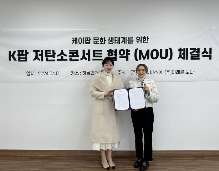 K팝 디지털 굿즈 전문 기업인 '미래를보다'(대표 김정하)가 다양한 엔터테인먼트 콘텐츠를 제작하는 '정유니버스'(대표 송정윤)와 손잡고 저탄소 콘서트와 관련된 업무 협약(MOU)을 체결했다고 밝혔다.