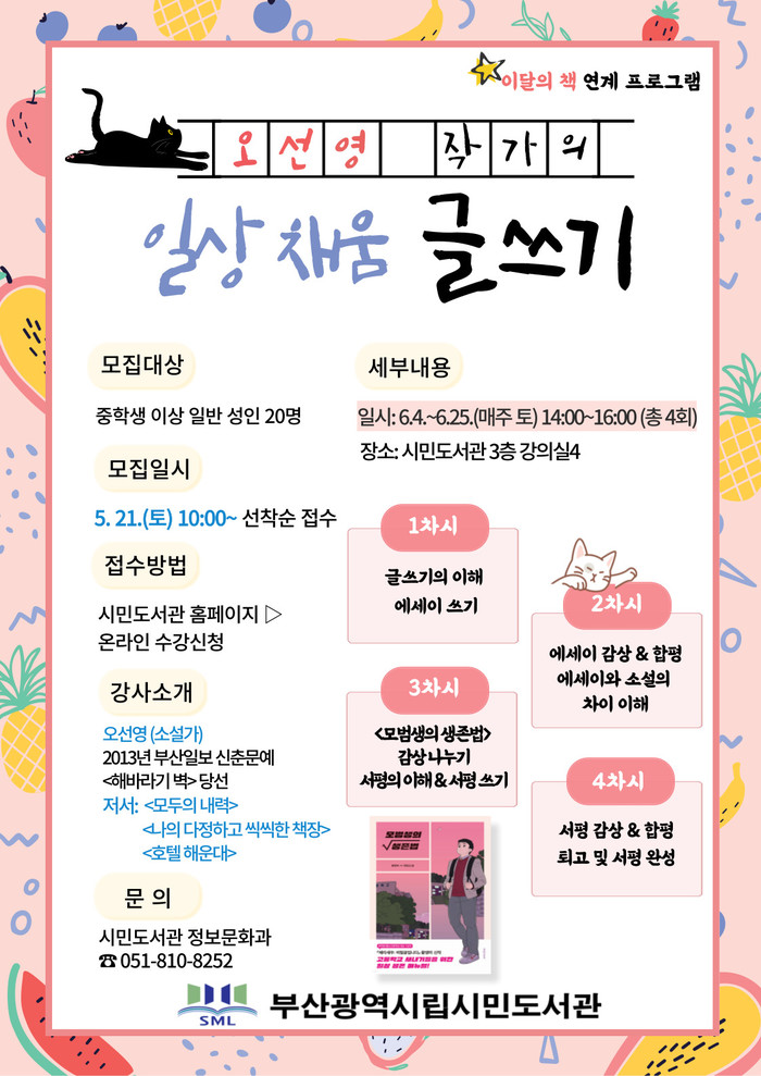 부산광역시립시민도서관(관장 김흥백)은 6월 4일부터 25일까지 매주 토요일 오후 2시 도서관 3층 강의실에서 성인을 대상으로‘오선영 작가의 일상 채움 글쓰기’프로그램을 운영한다.