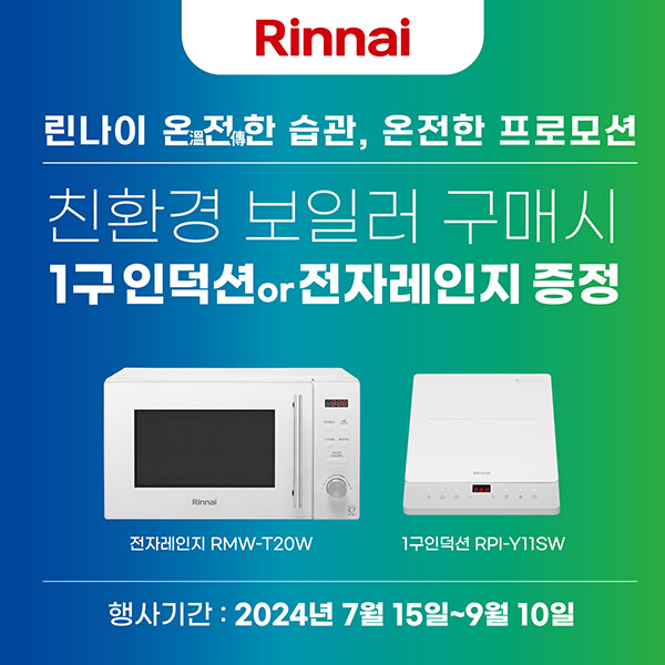 7월 15일부터 9월 10일까지 진행되는 이번 프로모션은 린나이 친환경 보일러(RC610, RC610-N, PJC8000, PJC8100)를 구입한 고객들에게 린나이 전자레인지(RMW-T20W) 또는 1구 포터블 인덕션 레인지(RPI-Y11SW)를 제공하는 감사 행사이다.