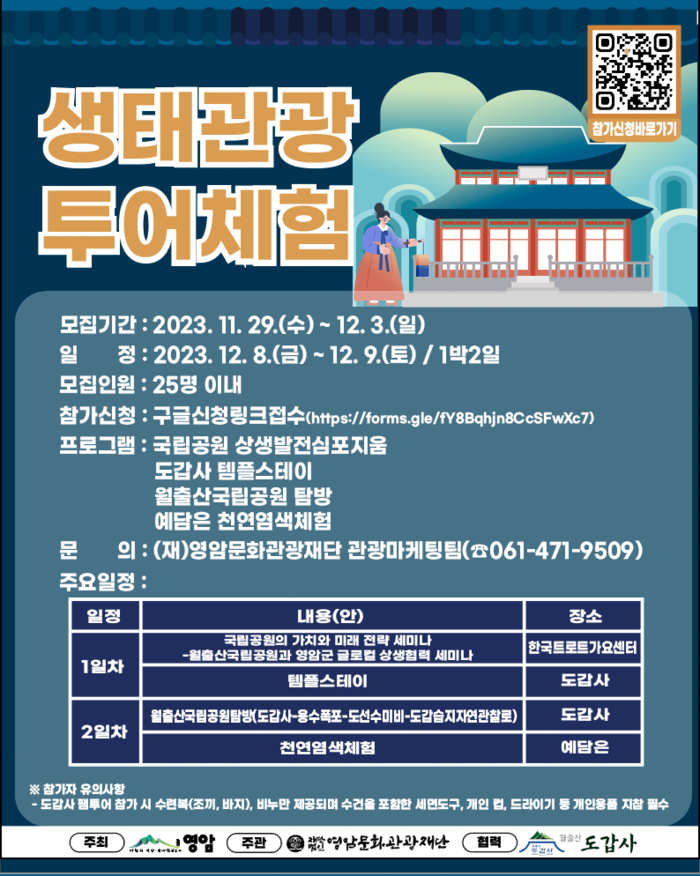 이번 영암 생태관광투어체험은 '2023 영암 생태관광 아카데미' 사업 중의 하나로 영암을 대표하는 생태관광 자원인 월출산과 도갑사의 숨은 명소를 관광하고 체험하는 프로그램이다.