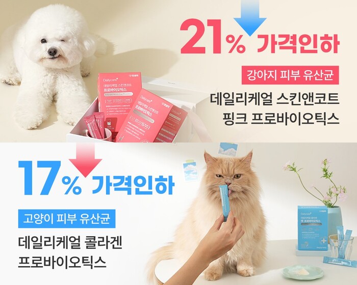 '데일리케얼 콜라겐 캣 프로바이오틱스(고양이용)'는 고양이의 장 건강에 도움을 줄 수 있는 유효성분이 1포에 180억마리 들어있는 것이 특징이다. 또한 특허 받은 균주를 사용했으며, 맛에 예민한 고양이들의 기호성을 위해 무향으로 제작된 것이 특징이다.