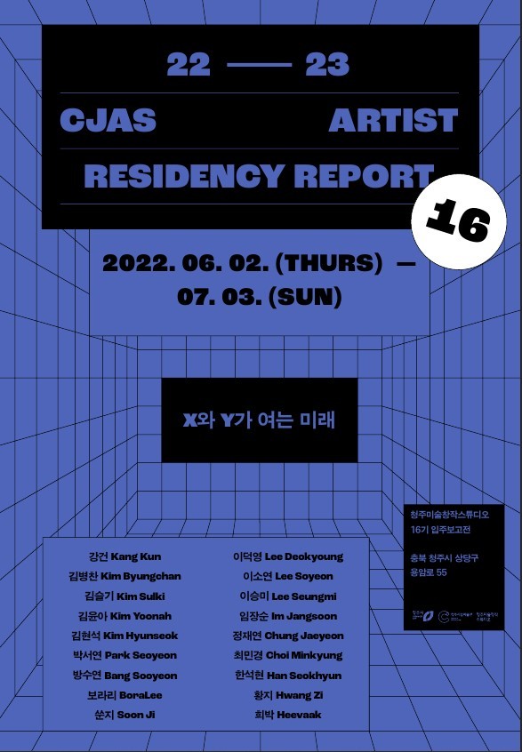 청주미술창작스튜디오는 6월 2일부터 7월 3일까지 용암동에 위치한 미술창작스튜디오에서 16기 입주작가의 활동을 알리는 입주보고 전시 《X와 Y가 여는 미래》를 개최한다.
