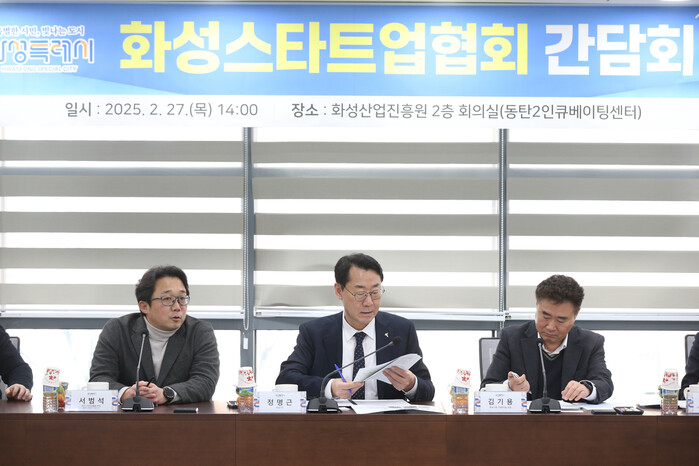 | ▲ 정명근 화성특례시장이 지난 2월 화성스타트업협회 간담회에서 스타트업의 의견을 경청하고 있다 /사진제공=화성특례시 |