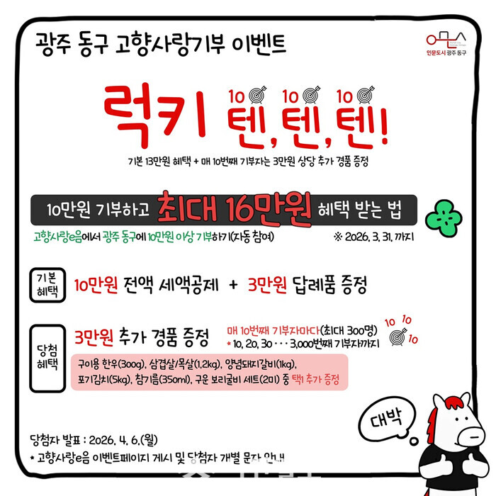 이벤트 기간은 이달 1일부터 31일까지이며, 고향사랑기부 공식 플랫폼 ‘고향사랑e음’을 통해 광주 동구에 10만 원 이상 기부한 사람을 대상으로 한다. 누적 기부 순서 기준으로 10번째, 20번째, 30번째 등 매 10번째 기부자에게 3만 원 상당의 답례품을 추가 제공하며, 최대 3,000번째 기부자까지 총 300명이 혜택을 받게 된다.