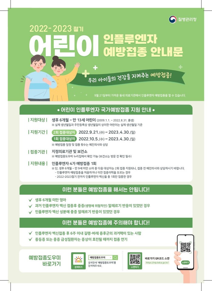 오는 9월 21일부터 실시하는 어린이 2회 접종 대상자로 생후 6개월부터 만 9세 중 생후 처음인 경우, 이전 접종력을 모르는 경우, 22년 6월까지 인플루엔자 백신을 1회만 접종한 경우 해당되는 어린이가 대상이다.
