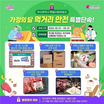박형준 시장은 “가정의 달을 맞아 5월 한 달간 가족 단위 외식 수요가 늘 것으로 예상됨에 따라 시민의 먹거리 안전을 확보하고자 이번 수사를 기획했다”라며, “시민의 건강에 위협이 될 수 있는 식품 관련 불법행위에 대해서는 관계 법령에 따라 엄정하게 조치할 예정이다”라고 밝혔다.