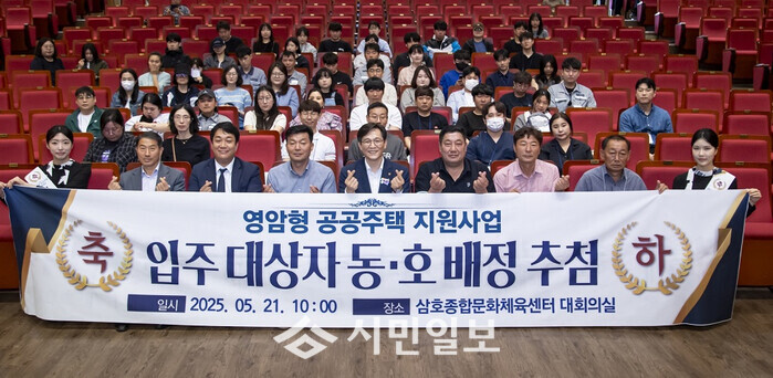 | ▲ 우승희 영암군수(앞줄 가운데)가 지난 5월 21일 삼호읍 소재 종합문화체육센터 대회의실에서 열린 '2025년 영암형 공공주택 지원사업 동 호 배정 추첨' 행사에 참석해 관계자 등과 기념촬영을 하고 있다. / 영암군 제공 |