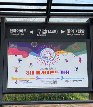 위탁관리 업체는 우선적으로 관내 버스승강장 30곳을 선정하여 3대 메가이벤트 홍보물 부착을 진행하였다. 아울러 올바른 버스승강장 사용에 대한 홍보영상물을 제작하여 위탁회사가 운영하는 김해시 최초 대형 전광판에 지속적으로 홍보함으로써 김해시민들에게 3대 메가이벤트 및 안전 관련 정보를 입체적으로 제공할 계획이다.