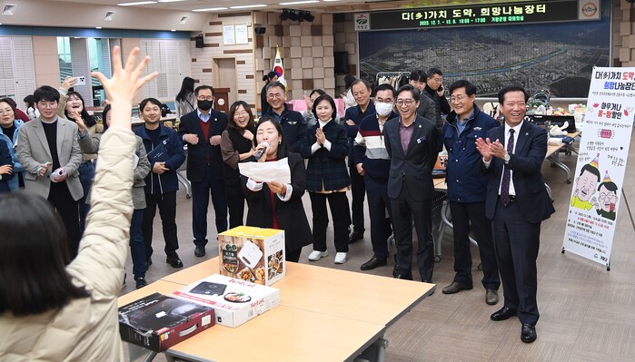 이번 행사에는 간부 공무원뿐만 아니라 전 직원이 적극 동참해 소형 가전제품, 가방, 화장품, 캠핑용품에서부터 담금주까지 다양한 물건 300여 점이 장터에서 판매되거나 나눔됐다.