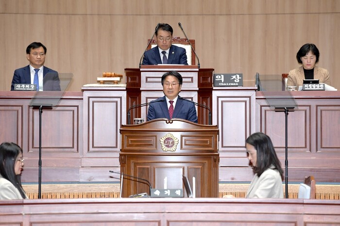 | ▲ 강기정 광주광역시장이 28일 오전 시의회 본회의장에서 열린 제321회 제2차 정례회 제3차 본회의에 참석해 2024년도 광주광역시 일반 및 특별회계 세입‧세출예산안 제출에 따른 시정연설을 하고 있다. /광주광역시 제공 |