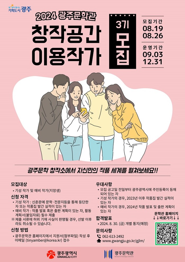 유정아 문화도시조성과장은 “광주문학관은 광주시가 직접 운영하는 시민과 작가들이 문학을 향유하는 문학 전문공간이다”며 “지역 작가들을 대상으로 작품 창작을 위한 공간을 제공함으로써 광주문학에 활기를 불어넣겠다”고 말했다.