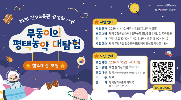 [평택=오왕석 기자] 평택시(시장 정장선)는 오는 4월 29일부터 10월 28일까지 2026년 전수교육관 활성화 지원사업 ‘무동이의 평택농악 대탐험’을 평택무형유산 전수교육관에서 매주 수요일, 1일 2회차 총 38회를 운영한다고 밝혔다.
