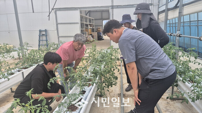 | ▲ 영암군, 지난 8일 청년 경영실습임대농장에서 방울토마토 재배 청년 임차인과 농업인에게 ‘2025 지역특화 품목 신기술 실용화 현장 컨설팅’ / 영암군 제공 |