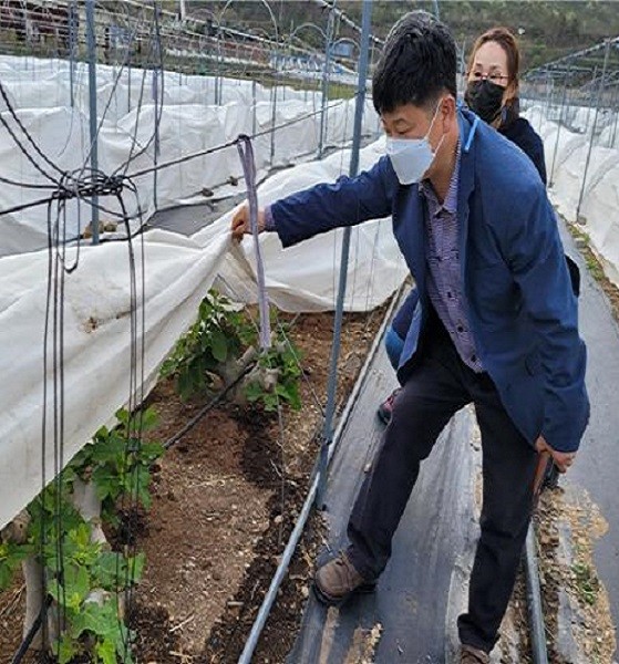 | ▲ 영암군농업기술센터 관계자가 무화과 동해피해 예방을 위해 나무 위에 씌워둔 백색부직포 내 무화과 과실수를 점검하고 있다. / 사진=영암군 제공 |