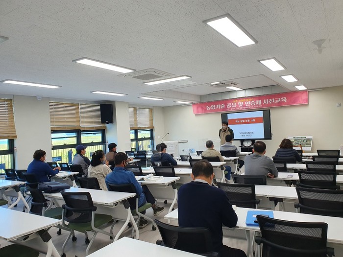 ※ 사진설명: 밀양시 농촌 신활력플러스사업 추진단 주최로 지난해 10월 밀양농업기술센터 농업인교육관에서 농업기술 공유 및 인증제 교육을 실시하고 있다.