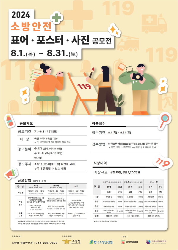 응시 자격은 국민 누구나다. 공모는 분야별 1인 1작품을 원칙으로 내달 31일 오후 6시까지 작품 파일과 참가신청서, 개인정보 수집ㆍ이용 동의서를 작성하여 한국소방방송 누리집에서 제출하면 된다.