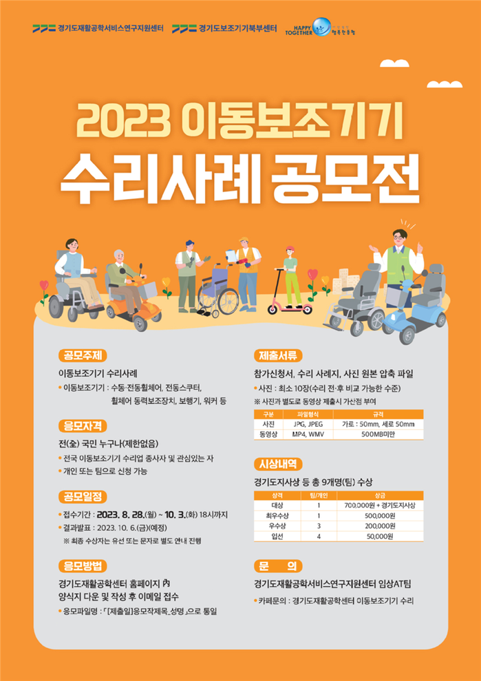 행복한동행 박희찬 대표이사는 “이동 보조기기는 자동차와 같이 지속적인 유지보수와 고장에 대한 즉각적인 수리가 필요한 장애인의 필수 이동 수단이다”며 “이번 공모전을 통해 보조기기 수리 종사자들의 기술력을 뽐낼 수 있는 기회가 되길 바란다”고 소감을 밝혔다.