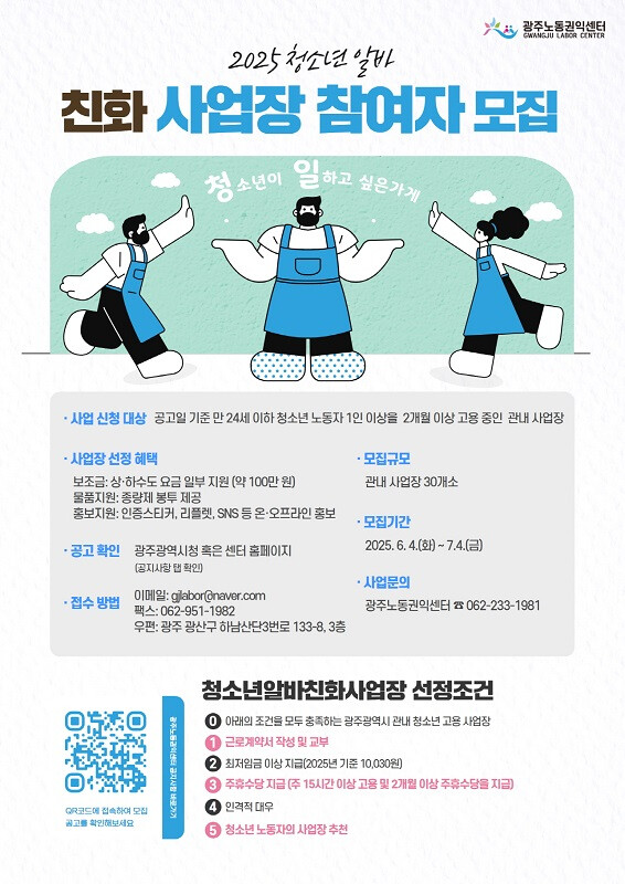 ‘청소년 알바 친화사업장’은 24세 이하 청소년을 고용하는 광주지역 사업장 중 근로기준법 등 관련 법령을 준수하며 청소년들이 안심하고 일할 수 있는 환경을 제공하는 사업장이다.