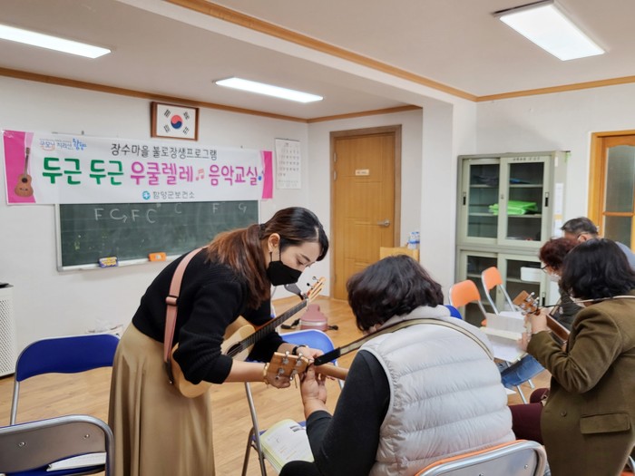 함양군은 장수마을 불로장생 프로그램으로 백전면 서백마을에서 사전 신청을 받은 10여명의 주민들을 대상으로 두근두근 우쿨렐레 음악교실을 운영하고 있다.