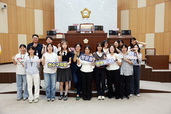 | 연수구의회 ‘주도형 청소년 의회 교실’ 참가자들이 포즈를 취하고 있다. |