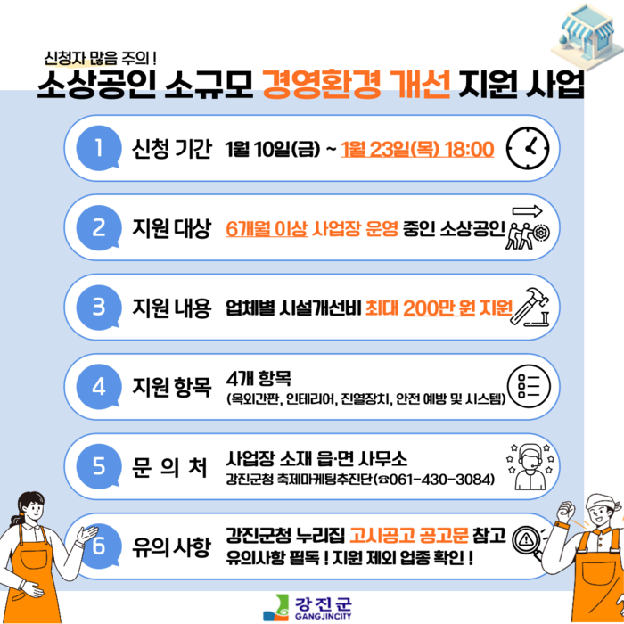 기타 문의사항은 강진군 소상공인 소규모 경영환경 개선 지원사업 담당자로 문의하면 된다.