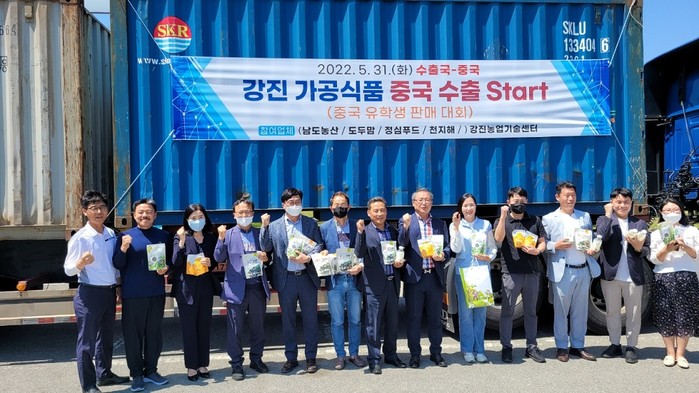 | ▲ 사진은 지난 5월 31일 강진군 관내 식품 가공기업 4개사 관계자 등이 생산하고 있는 상품들을 중국유학생판매대회를 통해 중국 수출 상차식을 갖고 기념촬영을 하고 있다. / 강진군 제공 |