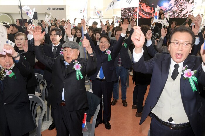 | ▲ 강기정 광주광역시장(뒷 줄 가운데)이 1일 오전 시청 시민홀에서 열린 제105주년 3.1절 기념식에 참석하여 참석자들과 함께 만세삼창을 외치고 있다. /광주광역시 제공 |