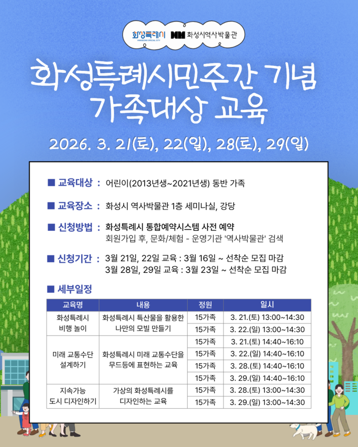 교육은 사전 예약제로 운영되며, 화성특례시 통합예약시스템을 통해 신청할 수 있다. 16일부터는 21·22일 교육 예약을, 23일부터는 28·29일 교육 예약을 할 수 있다. 모집 인원은 선착순으로 회당 15가족이며, 사회관계망서비스(SNS) 이벤트는 별도 예약 없이 현장에서 누구나 참가할 수 있다.