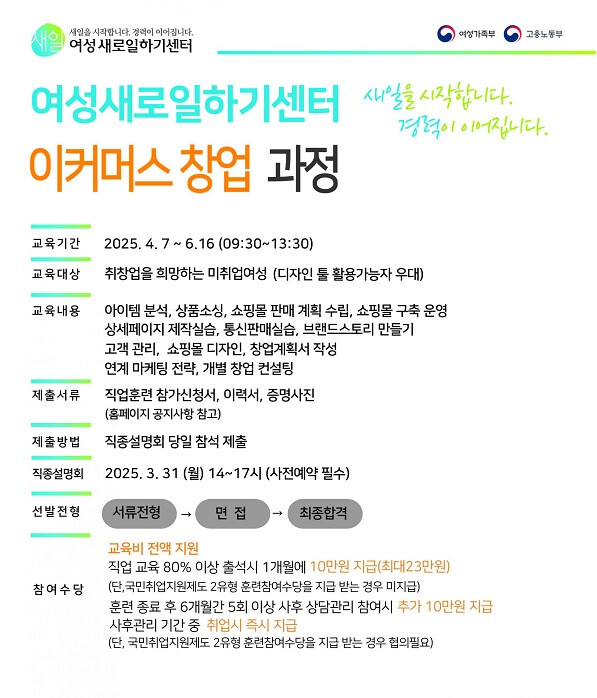 [시민일보 = 김민혜 기자] 송파여성새로일하기센터는 여성 파워 셀러 양성을 위해 '이커머스 창업' 교육 과정을 개설하고 훈련생을 모집한다고 밝혔다.