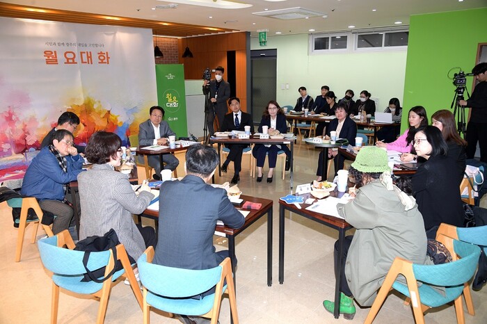 | ▲ 강기정 광주광역시장이 지난 27일 오후 시청 다목적홀에서 열린 월요대화에 참석해 도서관 운영 발전방안 등을 논의하고 있다./광주광역시 제공 |