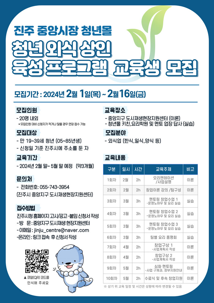 진주시는 지역 내 19세~39세 청년을 대상으로 하는 ‘청년외식상인 육성 프로그램’ 교육생을 2월 1일부터 16일까지 모집한다.