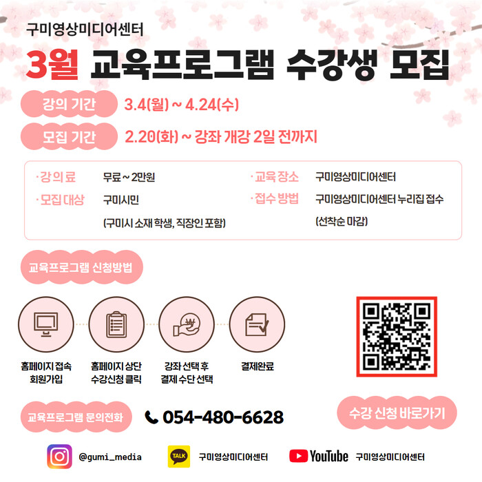[구미=박병상 기자] 경북 구미시영상미디어센터는 20일부터 구미시민을 대상으로 3월 교육프로그램 수강생을 모집한다.