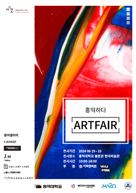 대학 내의 현대미술관에서 오는 19일~23일 기간에 진행되며, ‘홍익하다’ 아트페어는 여러 해 동안 개최한 ‘갤러리 연합전’을 한 단계 업그레이드한 행사로서 홍익대학교 학부 및 대학원 학생과 일반 작가 50명이 서울시 소재 6개의 갤러리와 함께 참여한다.
