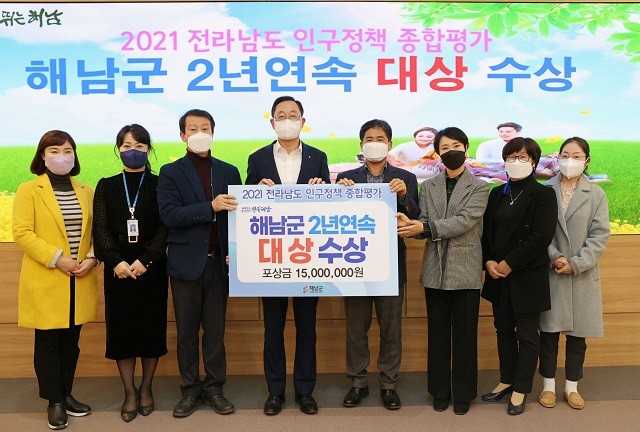 | ▲ 명현관 해남군수(가운데)가 해남군이 2021년 전라남도 인구정책 종합평가에서 대상을 수상하고 관계 실과 공직자들과 기념촬영을 하고 있다. / 사진=해남군 제공 |