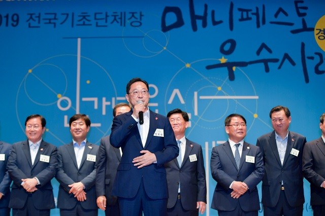 | ▲ 지난 2019년 전국기초단체장 매니페스토 경진대회에서 우수사례를 발표하고 있는명현관 해남군수 / 사진 = 해남군 제공 |