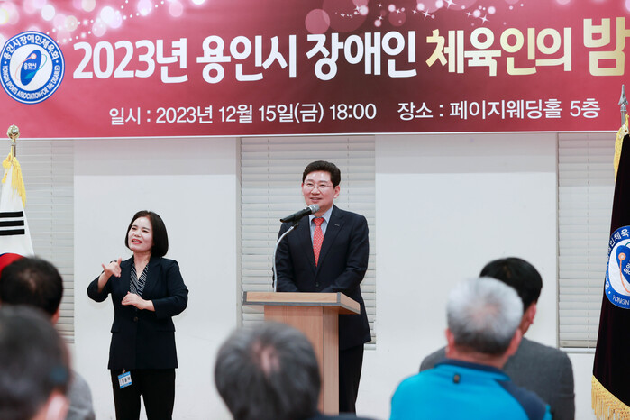 | ▲ 이상일 용인특례시장은 15일 저녁 처인구 유방동 페이지웨딩홀에서 열린 ‘2023년 용인특례시 장애인 체육인의 밤’ 행사에 참석해 장애인 체육인 등 관계자들을 격려했다. |