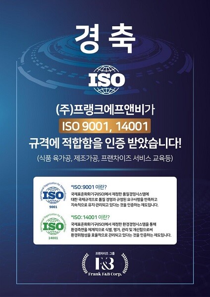 ISO 9001은 국제표준화기구(ISO)에서 제정한 품질경영시스템에 대한 국제 규격으로 품질 경영과 규정된 요구사항을 만족하고 지속적으로 유지 관리되고 있다는 것을 뜻하며. ISO인증을 받게 되면 국내 및 국외 시장에서 조직 및 브랜드 신뢰도를 인정받는 등 수제버거 시장에서 프랭크버거의 우수성을 한 번 더 입증하는 계기가 마련되었다.