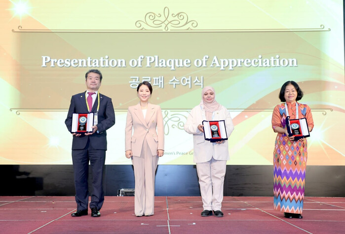 | 19일 대한민국 청주 엔포드호텔에서 IWPG 주최로 열린 ‘2025 세계여성평화 콘퍼런스’에서 공로패 수여식이 진행되고 있다. |