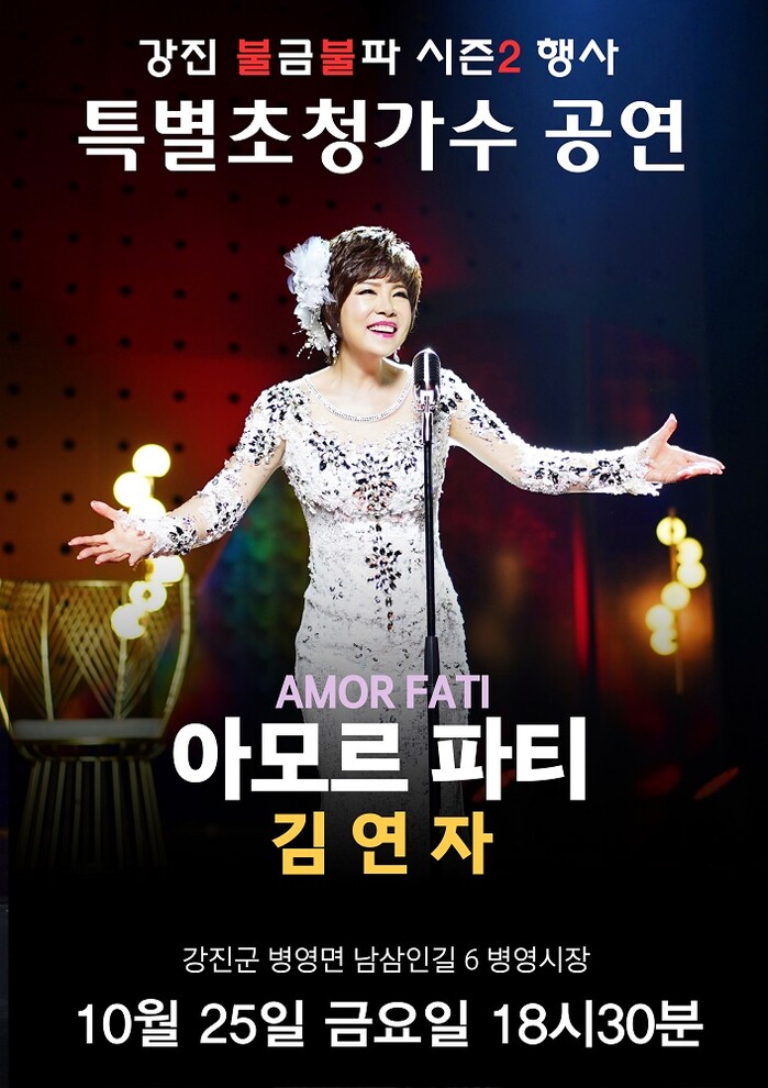 이번 공연은 강진 불금불파 시즌2의 마지막 날을 장식하는 하이라이트로, 전국적으로 사랑받는 곡 ‘아모르 파티’를 포함한 다채로운 무대가 준비될 예정이다.