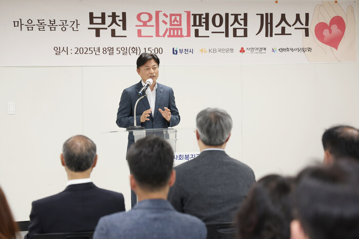 | ▲ 조용익 시장이 지난달 5일 ‘부천 온(溫)편의점’ 개소식에서 인사말을 전하고 있다. |