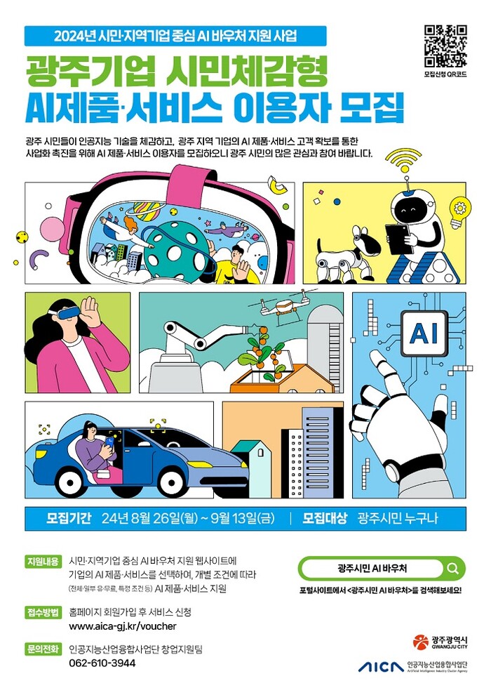 광주광역시(시장 강기정)는 인공지능(AI) 기술을 직접 체험하고 지역기업의 성장을 촉진하기 위해 ‘시민·지역기업 중심 인공지능(AI) 바우처 지원 사업’에 참여할 시민 이용자를 26일부터 9월13일까지 모집한다.