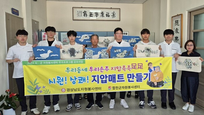 이날 합천군 자원봉사센터 우수프로그램 공모사업인 ‘우리동네 우리손주 지압 족족(足足) 시원! 상쾌!’의 일환으로 합천고등학교 학생들이 직접 만든 60여개의 지압매트를 전달했고, 지압매트는 지역 어르신들께 기부될 예정이다.