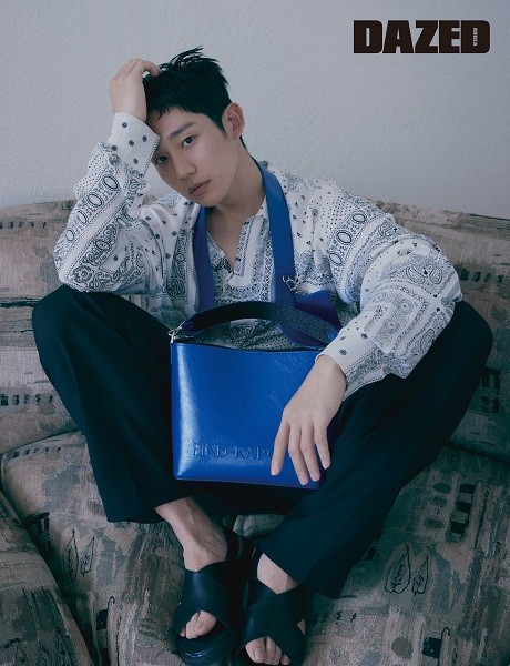 또 다른 화보 속에서 정해인은 페이즐리 패턴 셔츠와 청량한 로얄블루 컬러가 돋보이는 크로스바디백을 매치해 소년미 넘치는 룩을 완성했다.