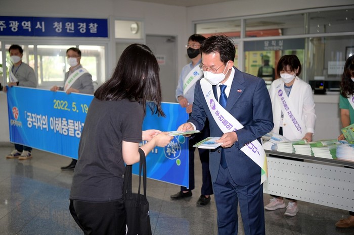 [광주=정찬남 기자] 광주광역시는 19일 오전 시청에서 출근하는 직원들을 대상으로 ‘공직자의 이해충돌방지법’(이하 ‘이해충돌방지법’) 홍보를 위한 청렴캠페인을 펼쳤다.