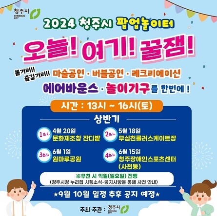 시는 이번 문화제조창 잔디광장을 시작으로 오는 10월까지(7~8월 제외) 첫째ㆍ셋째 주 토요일, 총 8회 팝업 놀이터를 운영할 계획이다. 우천 시에는 일요일에 운영하며, 청주시청 누리집(홈페이지)을 통해 사전 안내할 예정이다.